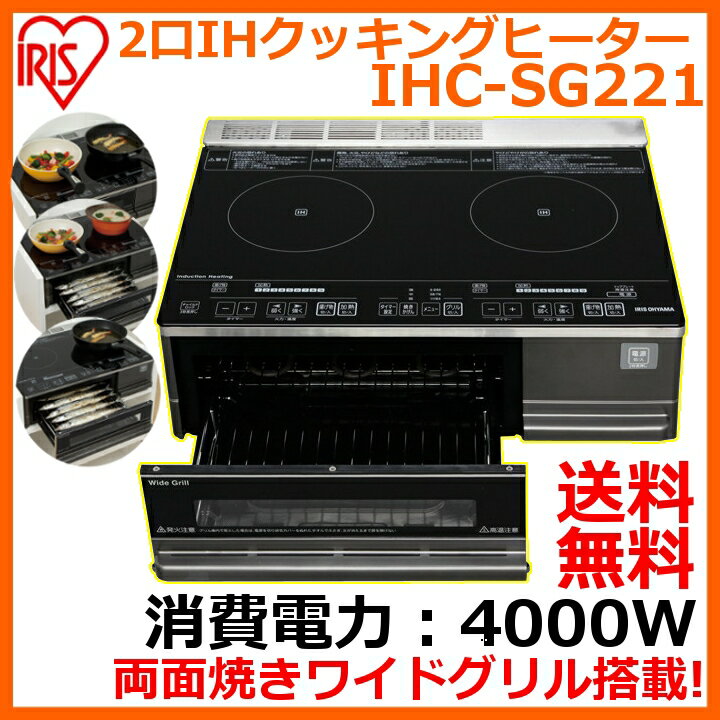 ※売切れ時はこちらよりお買い求めくださいませ。※ ■商品サイズ(約):幅59.0×奥行52.4×高さ18.0cm ■重量:16.8kg ■主要材質:本体・塗装鋼板、トッププレート・結晶ガラス ■電源:単相200V(50/60Hz共用) ■消費電力:4000W ■グリル庫内サイズ(約):幅35.0×奥行31.7×高さ10.4cm ■ヒーター:【IHヒーター】左・2500W、右・2500W、【グリル(シーズヒーター)】上・800W、下・1100W ■火力調節:9段階 100W相当(900W間欠動作)?2500W ■タイマー:【左/右ヒーター】1分?9時間50分(火力1?5)、1分?1時間(火力6?9)、【グリル】1分?30分 ■電源コード:長さ:0.7m(2.0mm2、3芯キャブタイヤケーブル) ■使えるなべ: 材質(鉄・鉄鋳物、耐熱ホーロー、ステンレス、多層鋼なべ) 大きさ(左右ヒーター・直径12?26cmのもの) 形状(底の平らなもの、反りが3mm以下のもの ※揚げ物調理のときは反りが1mm以下のもの) ■使えないなべ: 材質(耐熱ガラス、陶磁器・土なべ、アルミ・銅) 大きさ(直径12cm未満のもの、トッププレートからはみ出すサイズのもの) 形状(中華なべなど底が丸いもの、底に段がありトッププレートに密着しないもの、脚があるもの) ※IH調理器では、材質や大きさにより使える鍋と使えない鍋があります。 使用する鍋は、財団法人「製品安全協会」のSGマークのあるものをお勧めします。 電源200V!ガスコンロに負けない火力!両面焼きワイドグリル搭載!据置型IHクッキングヒーター♪ 2つのヒーターで料理の加熱から揚げ物まで多用途に使用可能です。 グリル付きで焼き魚も可能です。 左右ヒーターとも2500Wの高火力IHヒーター!最大4000Wまで使用可能です。 9段階の火力調節ができ様々な調理に対応できます。 両面焼きグリルはワイドサイズ!大きな魚でもラクラク調理可能! 魚も横向きに置けるので調理の様子分かりやすいです。 お子様のいたずら、事故防止のチャイルドロック機能付きです。 煮込み料理などに便利なタイマー機能付きです。 グリルにもタイマー付きで便利! 火が出ないので、安心安全に調理ができます。 ?5つの安全機能? 【なべ検知機能】使えるなべ、使えないなべを自動的に判別します。 【なべなし自動OFF】なべをのせないで加熱を始めると、自動的に加熱を終了します。 【小物検知機能】スプーンなどのなべ以外の小物を置いて加熱すると、自動的に加熱を終了します。 【切り忘れ自動OFF】調理を始めて、45分以上キー操作をしないと、自動的に加熱を終了します。 【温度過上昇防止機能】なべ底の温度が高温になりすぎると、自動的に加熱を終了します。