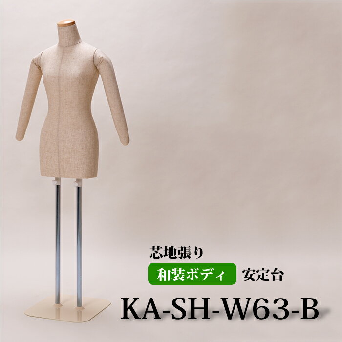 女性の体型を想定して作られたくびれのある和装ボディ、「ウエスト63cmタイプ」。 補正の練習が出来るため、着付けの上級者 を目指す方、 ビギナーはもう卒業 してさらにステップアップをという方におすすめ。 表面が芯地布張りのため着物を着付ける際も滑りにくく、 着付けがスムーズにできます。 腕ありタイプなので、より人の身体に近い感覚で練習できます。 腕を水平に広げることで着物がずり落ちることもありません。 和装ボディは、帯が締め付けやすい様 にウエストのところに軟質材を使用しています。 スタンドは通常のベースよりも大きなベースを使用していますので、安定感は抜群です。 ★更なるスキルアップを目指すお客様の声を参考に作られた、 プロフェッショナル仕様のオリジナル和装ボディとなっております。 商品名 和装ボディ 着付けトルソー 着物用マネキン 芯地布張り 腕付き 安定台 W63cm 型番 KA-SH-W63-B 素材 芯材:硬質発泡材 表面:芯地布張り サイズ(cm) B W H 肩幅 ボディ丈 全体高さ 82 63 87 38(腕なし:32) 77 125〜170 ヘッド 木製 クリア 腕 ウレタン腕 自由に曲がります。 ※肩は回りません。 ベース スチール製 アイボリー 40×35cm 重量 6.0kg ※オプションにてベースの裏側にフェルトを張ることも可能です。(金額は後ほどスタッフが手動で修正いたします)