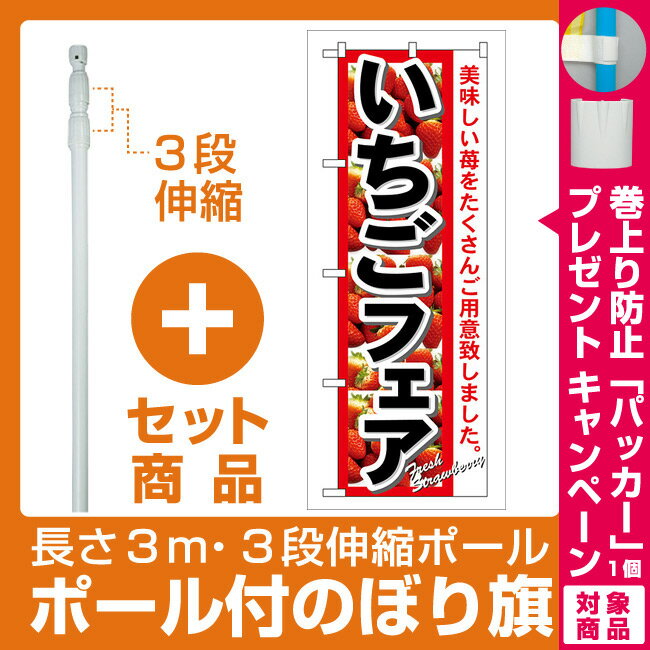 標準出荷日(目安)1?2日後※土日・祝を除く※お急ぎのお客様は恐れ入りますが、必ず事前の在庫確認をお願い致します。送料について本商品の送料表はページ下部に掲載しております。送料表を見るセットアイテムは単品でも販売しております。▼以下の商品バリエーションをご覧ください。商品バリエーション本商品にはバリエーションが2点ございます。のぼり旗 いちごフェア のぼり 農園の直売所や即売所/イベント/果物狩り/味覚狩り会場の販促にのぼり旗 (苺/イチゴ) のぼり3段伸縮ポール(白) (846)関連商品のご紹介【3点セット】のぼりポール(竿)と立て台(16L)付ですぐに使えるのぼり旗 いちごフェア 美味しい苺をたくさんご用意致しました 7890 農園の直売所や即売所/イベント/果物狩り/味覚狩り会場の販促にのぼり旗のぼり旗ポール台 角形16Lのぼり立台 (ポール台) のぼり旗ポール台のぼり旗ポール台 のぼり立台 (ポール台) ドーム君20L のぼり旗ポール台のぼり旗ポール台 のぼり立台 (ポール台) てんとー君11L のぼり旗ポール台のぼり旗ポール台 鉄板のぼり立台 (ポール台) 30cm角 (黒) のぼり旗ポール台のぼり旗ポール台 鉄板のぼり立台 (ポール台) 30cm角 (白) のぼり旗ポール台のぼり旗ポール台 鉄板のぼり立台 (ポール台) 45cm角 (黒) のぼり旗ポール台のぼり旗ポール台 折り畳み式ポール台 のぼり旗ポール台のぼり旗 のぼり旗巻き上がり防止商品 部材 カラマナイ No. のぼり旗巻き上がり防止商品 部材 のぼり旗のぼり旗 のぼり旗巻き上がり防止商品 部材 パッカー No. のぼり旗巻き上がり防止商品 部材 のぼり旗本商品の送料区分:のぼり旗こちらの商品郡の送料は、複数点ご購入でも下記の送料(1配送分)のみかかります。離島・一部地域は追加送料がかかる場合がございます。お気軽にお問い合わせください。のぼりポール(竿)がセットになったのぼり旗!農園の直売所や即売所/イベント/果物狩り/味覚狩り会場の販促にのぼり旗■のぼり旗の写真■付属のぼりポール情報■ポール(竿)が付いてすぐに使えるデザインのぼり旗(のぼり/登り/幟)シリーズ。 農園の直売所や即売所/イベント/果物狩り/味覚狩り会場の販促にのぼり旗 ■【セット品】のぼり旗情報 果物を販売するための販促物ご用意しております。 ●道の駅・直売所、スーパーマーケットで設置してアピールしましょう。 ●色や形は実際の商品と若干異なる場合があります。予めご了承ください。 ■のぼり旗 いちごフェア 7890 の商品スペック ●サイズ : W600×H1800mm ●素材 : ポリエステル製 ■【セット品】3段伸縮ポール(白) (846) スペック表 ●サイズ:1.1?3メートル ●横棒(かんざし)長さ:850mm ●ポール太さ:Φ25mm(強風に強い太め仕様) ●適用のぼり旗サイズ:600×1800mm(もっとも一般的な寸法) ●重量:約720g ●材質: ターンキャップ:ABS樹脂・PP ジョイント部:ABS樹脂 下キャップ:PP 横棒:FRP・PP パイプ部:スチール(鉄)パイプに樹脂コーティング・PP