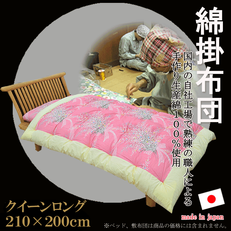 サイズ クイーンサイズ 約210×210cm(側生地サイズです) 側 地 綿100% 重 量 約6.0kg 中わた 綿100% ≪店長からの一言!≫ 創業90年の当店自家製造、手造りの掛布団です。ホームサンター、量販店に売られているような吹込み仕立と違い、熟練した職人さんが一枚一枚丁寧にお造りしていますので寝心地が違います! ※誠に恐れ入りますが、ご注文が込み合っている時は、配送日時指定をご希望頂いてもご希望に添えない場合もございますので、予めご了承の上ご注文下さいませ。 ※ピンク系はオレンジなどの暖色系を含む色合いとなります。(紫はピンク系に含まれます。) ブルー系は、緑など寒色系を含む色合いとなります。 ※画像の色合いにつきましては、パソコンの設定などにより、実物と多少異なることがありますのでご了承下さい。 ※沖縄、離島、一部地域の方は中継料が別途発生します。予めご了承ください。 ※綿掛けふとん・敷きふとんは個別送料の為、個数分の送料がかかります。