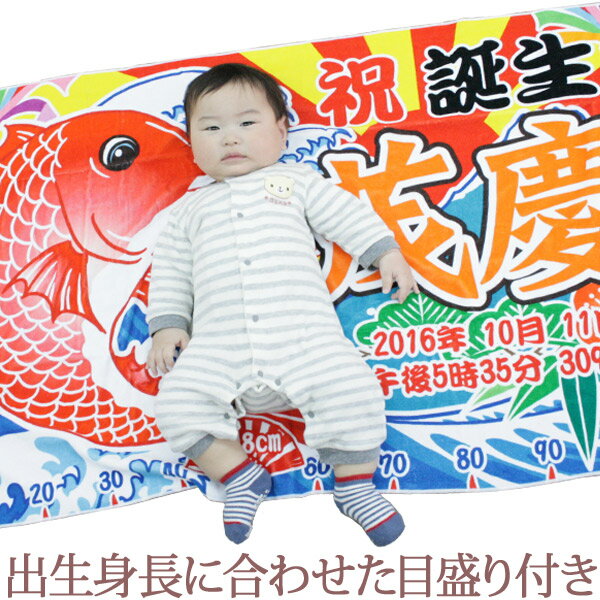 出産祝い 名入れ バスタオル 名前入り 男の子 女の子 今治 送料無料定番の和柄デザインで注目度アップ!「大漁旗」デザインのバスタオルです。「お名前」を入れられる他、お子様の日々の成長がわかる「身長計測」の目盛り付き♪「お誕生日」や「出生時間」「出生体重」も無料で入れることができます。(もちろん、お名前のみでも制作可能です。)サイズは70cm×120cmで、小さなお子様にはお昼寝のタオルケット(ブランケット)代わりにもなり、成長してからもバスタオルとしての他、海水浴やスイミングスクール、プールや海遊びのビーチタオルにも使えます♪出産祝いとして贈った後も長くお使いいただけ、一生の宝物と喜ばれる当店だけのオリジナルタオルです。★お子様のお名前とデザインが合体★ココロコではデザイナーがタオル作成前に文字のバランスを調整して、刺繍ではなく元々のタオルのデザインに名前を入れます!ですから仕上がりの奇麗なオリジナルの名入れギフトができるんです。既製品タオルへの後入れ刺繍とは違い、セミオーダーで作るメモリアルな一点ものの今治製タオルは★世界でたった一つだけの贈り物★二人目三人目の出産祝いでも他とかぶらないお祝いとして喜ばれています。★おむつケーキと同梱可能★もっと感動する贈り物にしたい方はおむつケーキ アニマルワールドとの同梱がオススメ♪富士山と波を背景に松竹梅が入り、鯛も飛び跳ねるデザイン。ご両親が一生懸命考えて付けたお名前を大きく入れることができますので、届いた時の感動も一層大きなアイテムです。■ Item Specサイズ縦70cm×横120cm素材綿100% 安心の国産。国内有数の日本製タオル生産地、愛媛県今治(いまばり)市製。重さ約370gおもな用途出産祝い 内祝い 1歳の誕生日プレゼント 3か月・6か月祝い ハーフバースデー 百日祝い 100日祝い配送についてのご注意プリント前イメージ確認についてプリント前イメージの確認を希望の方は、約3営業日でメールにてデザイン画像をお知らせします。もしここで名入れ情報の変更がある場合は無料で修正します。■ご注意 イメージ確認「する」を選択された場合「イメージ画像を確認し、制作OKのお返事」を頂くまで実物の商品制作はいたしません。当店からのメールは必ずご確認ください。※デザインの変更は別途有料カスタマイズをご案内します。お気軽にお問い合わせください。お急ぎの方はバスタオルカタログギフトをどうぞ ⇒↑ 出産祝い に ! 名入れ バスタオル の全部のデザインを一覧で見て選べます。すべて今治製の高級バスタオル ↑「一生の宝物!」と 喜ばれる 名前入り 今治製バスタオル バスタオルを広げた場合、身長155cmのママでしたら肩からくるぶしくらいになります。既製品に刺繍する名入れではなく、タオルのデザインにお名前が入る本格的なオリジナルギフトです。うまれたばかりの赤ちゃんのおくるみにもどうぞ♪お子様が寝返りの時期から歩く、走りだす時期はもちろん、お出かけ時のベビーカーの膝かけとしてもお使いいただけます。 ★生まれた身長に目印つき★ タオルには約120cmまで測れる目盛が付いております。生まれたときの身長には目印をつけて表示。タオルに寝かせて写真をパシャリ。日に日に大きくなるわが子を一目でわかることができます♪ ★大きくなっても使える★また、タオルですので、Tシャツやロンパースのようにサイズが合わなくなること(サイズアウト)を心配する必要はありません。保育園や幼稚園でのプールやお昼寝用のタオルケット(ブランケット)としても使える大きさですので、長くご愛用いただけます。お祝いのギフトだからこそ品質・日本製にこだわっています■タオル表面はパイル部分を短くカットする「シャーリング加工」をしています。(※パイルとは表面の糸を「ループ状(輪)」にしたものです) タオルの毛先を一定にすることでプリントが通常より鮮明に出て、なめらかな肌触りで糸をひっかけにくい、吸水性の高いタオルになります。色落ちしにくい加工済み!洗濯機で洗えます色落ちしにくい蒸し加工&後洗い済みですので、家庭用の洗濯機で洗っていただけます!贈る側からは気付きにくい所ですが、実際に使ってみて驚きの声もいただく高品質な今治製タオルならではのポイントです♪(財)日本タオル検査協会合格商品タオルの検査・品質試験と証明を行う試験検査機関、日本タオル検査協会による品質検査の合格品です。(バスタオル・フェイスタオルにはタグ付け、ハンドタオルは包装フィルムに表示)表面加工によって、なめらかでつややかさのあるベルベット調の手触りになっています。タオルは丁寧に縫製して丈夫な仕上がり。(縫製糸の色は変わることがあります)裏は吸水性のあるパイル地を使用しています。(財)日本タオル検査協会合格商品。お客様写真舘 多くの方に喜ばれています♪お客様写真ぞくぞく追加中♪ もっと見る⇒↑「出産祝いに世界に1つの名入れギフトを届けたい…」ココロコ