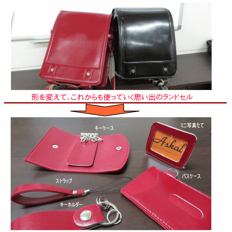 ランドセルリメイク 6年間の思い出のランドセルを キーケース パスケースなどへリメイク 飾る思い出から、使える思い出の品へ 製作商品 キーケース パスケース ミニ写真たて キーホルダー ストラップ ご注文後 受注番号 ご注文者様の住所 郵便番号 お名前 電話番号 配送先が別が別の場合は配送先の情報をランドセルと一緒にお送りください ランドセル配送先 494-0012 愛知県一宮市明地字西七丁原32-1 Askalカバン工房(ランドセルリメイク)0586-58-4531 発送時期 最大2か月ほどかかります ランドセルの状態 ひび割れなどで状態が悪い場合は、出来上がりに影響がございます 製造 Made in Japan by Askal ランドセルの素材など 本革 クラリーノでもOK かぶせ部分が小さい(半かぶせタイプ)のランドセルは製作出来ません ラッピング 不可商品 送料 他商品と同梱はできません ランドセルリメイクは単体でのご注文となります 名入れ 当社使用のイタリア革タグへの刻印となります その他 お気軽にご相談下さい
