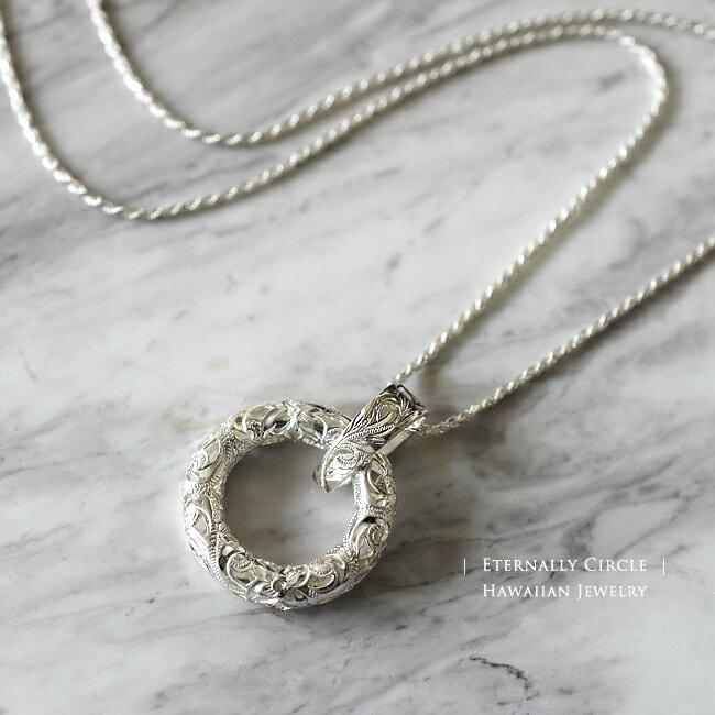 繊細な透し模様が美しいエタニティサークルペンダント。仕様が新しくなり、バチカンにも手彫りが施されています。 波が幸せを乗せて運ぶ「スクロール」とプルメリア。 巡りくる幸せを永遠にするラウンドサークル。永遠に途切れることの無いことを意味するペンダントです。 ハワイ工房より直輸入・職人による手作業で丁寧な仕上り。あなたにはワンランク上のハワイアンジュエリーを。 ◆製品仕様◆ 素材 Silver925 サイズ(外側) H27mm×W27mm重さ8.5g ブランド・輸入先 ハワイ工房直輸入 付属チェーン 3種類の長さからお選びください 付属品 ・品質保証書 ・クッション入りBOX ・ソフトポーチ 文字入れ・刻印 対応していません 付属するSILVER925製カットロープチェーンは、 3種類の長さからお選び頂けます。 (40cm・45cm・50cm) ◇ Information ◇ 送料 無料 贈答用リボン 無料 ラッピングについて 商品は専用のお箱に入れ丁寧にお届けいたしております。さらに、ご希望の方にはリボンラッピングを無料にて承っております。購入STEP-3にてご指定ください。 ・パステルピンクまたはオレンジ ・ブラウン ※梱包資材は予告無く変更になる場合がございます、予めご了承下さい。 *ご使用のモニタの機種または設定等により、実際の色と異なる場合がございますご了承ください。 ○初期不良に関しての返品・交換○ 商品の品質について万全を期しておりますが、万一商品が破損・汚損していた場合やご注文と異なる場合は、お届け後7日間以内にご連絡をください。お客様から返送いただいた商品を確認後、交換商品の発送準備が整い次第、商品発送日のご連絡をいたします。※上記以外の理由での返品・交換はこちら ◆刻印した商品、オーダーメード商品、Maxi商品及びピアス、チェーン等の交換・返品はお断りいたします。 ○在庫・納期表示について○ 在庫管理システムで複数店舗共有しております関係上、ご注文のタイミングによりお品切れや工房お取り寄せとなる場合がございます。ご了承下さい。